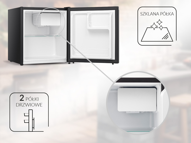 ТЕХНІЧНІ ПАРАМЕТРИ Клас енергоспоживання: EЗагальний об'єм: 45 л Маса нетто/брутто пристрою: 14/15 кг Холодоагент: R600a Рівень шуму: 39 дБ Річне споживання енергії: 80 кВт/год Джерело живлення: 220-240 В 50 Гц