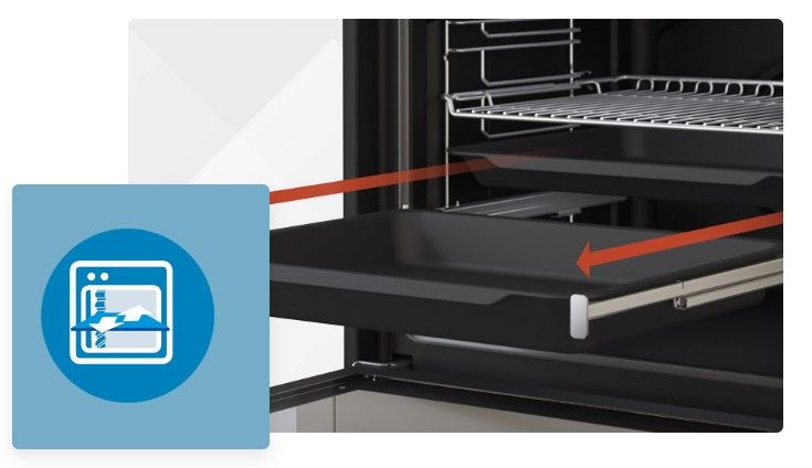 Телескопічні напрямні роблять керування духовкою легким і зручним. Завдяки їм ви можете не тільки швидко, але й безпечно вставляти деко в пекарну камеру та витягувати її з неї.