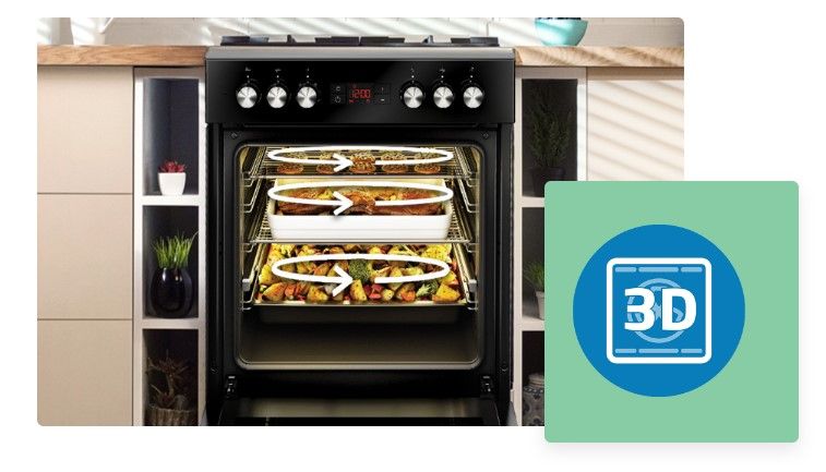 3D-випічка — це нове покоління випікання, яке активує всі нагрівальні елементи, наявні в даній моделі, і працює багатовимірно. Нагрівачі духовки працюють послідовно, щоб рівномірно розподілити тепло всередині. 3D-випічка також дозволяє випікати декілька страв одночасно.