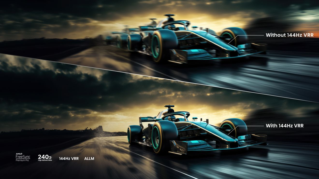 Зберігайте свою конкурентну перевагу Ігровий режим 144 Гц Pro автоматично запускається, коли ALLM виявляє підключення до гри. Завдяки 144 Гц VRR ви можете насолоджуватися максимально плавним ігровим процесом, який ще більше покращується завдяки наднизькій затримці вхідного сигналу. Завдяки технології AMD Freesync Premium Pro, спеціально створеній для максимально швидкого реагування та найдеталізованішого ігрового досвіду, розриви й затримки на екрані залишилися в минулому.