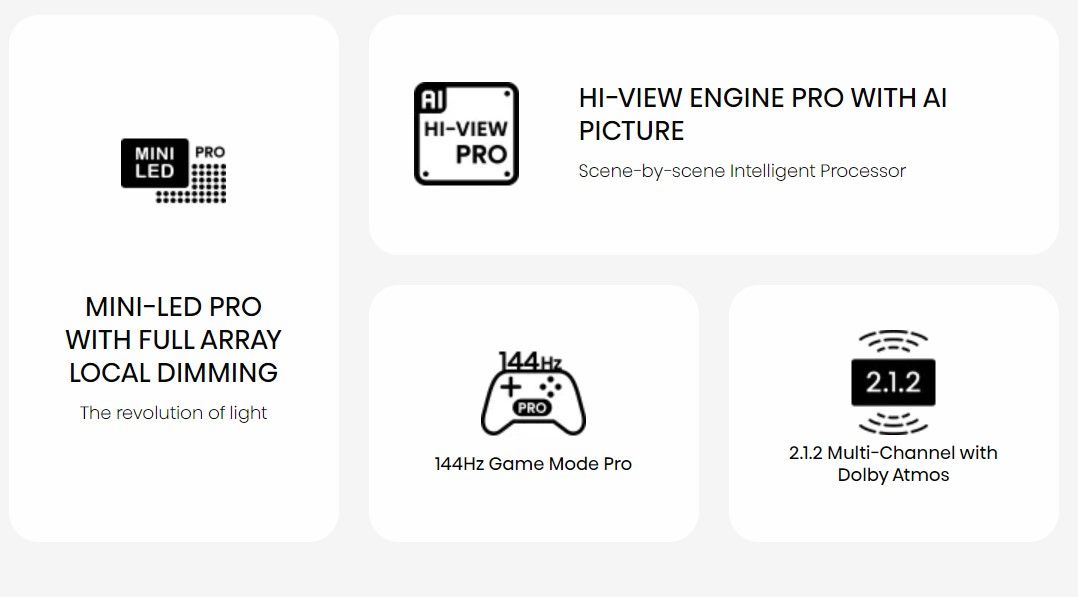 Інтелектуальний процесор Scene by Scene. Новий Hisense Hi-View Engine PRO використовує передову технологію штучного інтелекту для покращення вмісту, незалежно від введення. Кожен кадр налаштовується в режимі реального часу, щоб забезпечити найкраще можливе зображення шляхом покращення роздільної здатності, яскравості, контрастності та кольору. Ви будете насолоджуватися якісними зображеннями 4K із різкістю, чіткістю та реалістичними деталями.