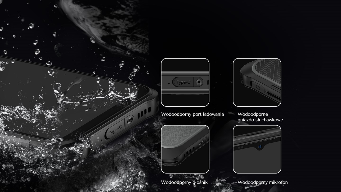 Ми дуже подбали про те, щоб зробити цей телефон повністю водонепроникним. Зарядний порт і роз’єм для навушників мають водонепроникні кришки, а динамік і мікрофон покриті водонепроникними матеріалами. У телефон не потрапить навіть крапля води чи порошинка, а падіння та удари не зашкодять йому.