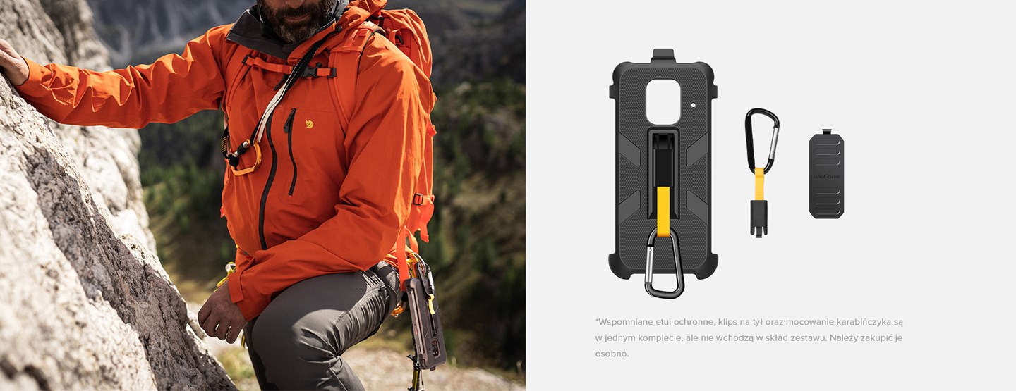 Настроюваний захисний чохол виготовлений із твердого пластику для додаткового захисту. Оснащений міцним карабіном і затиском для пояса, який обертається на 180 градусів, він дозволяє прикріпити телефон до пояса та рюкзака, що полегшує доступ до телефону під час подорожей.