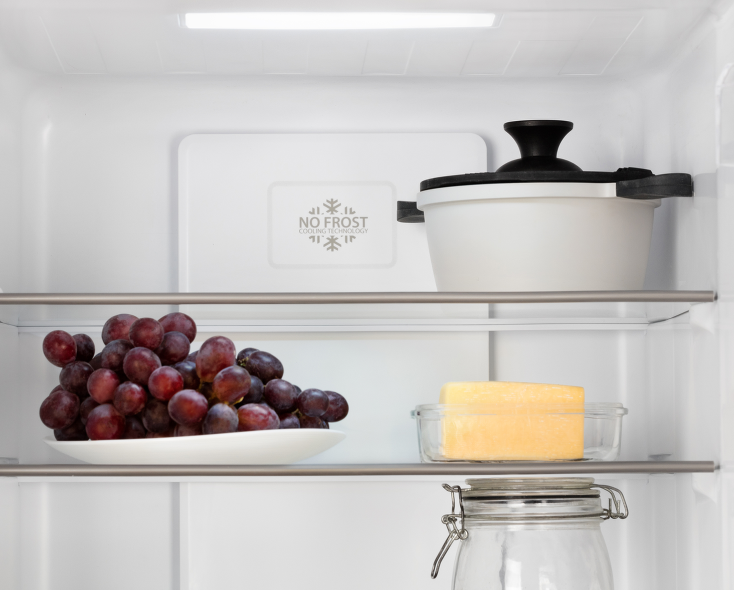 Технологія No Frost заснована на подачі сухого повітря в холодильник через спеціальні канали. Система вентиляції забезпечує циркуляцію холодного повітря, видаляючи всю вологу назовні. Таким чином іній і лід не накопичуються на продуктах, полицях або стінах; зберігається в спеціальній камері, де розморожується і видаляється.