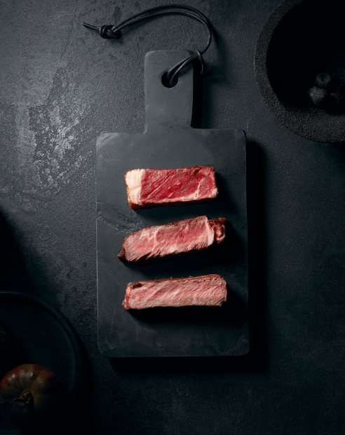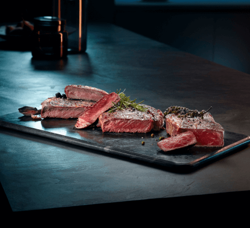 КРИВАВИЙ М'ясо сильно підрум'янюється і зберігає свій унікальний темно-червоний колір всередині. Стейк залишається ідеально соковитим. Це один із ступенів готовності м’яса, якому віддають перевагу багато гурманів. СЕРЕДНЯ РІДКІСТЬ Структура стейка стає більш компактною, а колір м'яса всередині стає більш інтенсивним. Стейк виділяє ароматні соки. МОЛОДЦІ Чудовий вибір для тих, хто віддає перевагу повністю, ідеально просмаженому м'ясу.