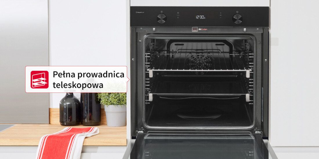 Зручне виймання навіть важких тарілок. Завдяки телескопічній направляючій виймання гарячого та важкого дека з духовки більше не проблема. Завдяки направляючій ви можете висунути всю решітку з гарячою стравою з зони гарячої духовки та безпечно вийняти її, не турбуючись про те, що торкнетеся гарячих елементів. Використання телескопічної направляючої не тільки полегшує завантаження та виймання важкого посуду, але й робить роботу з духовкою безпечнішою.