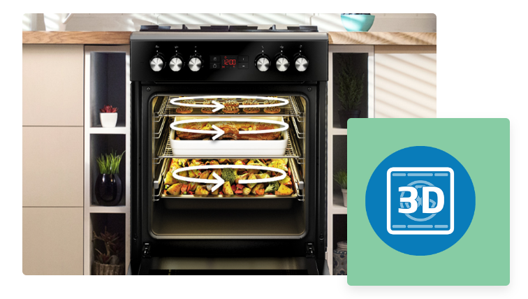 3D-випічка — це нове покоління випікання, яке активує всі нагрівальні елементи, наявні в даній моделі, і працює багатовимірно. Нагрівачі духовки працюють послідовно, щоб рівномірно розподілити тепло всередині. 3D-випічка також дозволяє випікати декілька страв одночасно