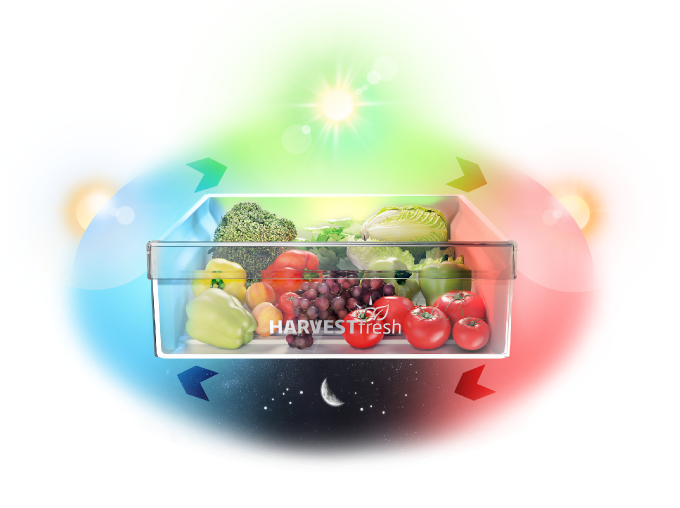 Це інноваційна 3-колірна технологія, яка дозволяє довше зберігати вітаміни А та С в овочах і фруктах, що зберігаються. Завдяки цьому наші продукти довше залишатимуться свіжими. У спеціальному ящику HarvestFresh 24-годинний цикл сонця імітується за допомогою синього, зеленого та червоного світла