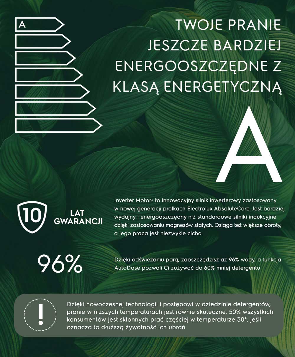 Inverter Motor+ – це інноваційний інверторний двигун, який використовується в пральних машинах Electrolux AbsoluteCare нового покоління. Він більш ефективний і енергозберігаючий, ніж стандартні асинхронні двигуни, завдяки використанню постійних магнітів. Він також досягає вищих обертів і працює надзвичайно тихо.