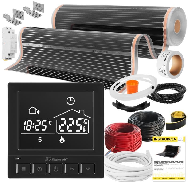 Повний набір інфрачервоного опалення, який можна використовувати як: Тепла підлога Настінне опалення Стельове опалення Дзеркальне опалення (антипаровий) Набір включає: IR BLACK SILVER PTC нагрівальна плівка 160 Вт/м², ширина 100 см Контролер температури Підлоговий датчик температури NTC 10 Ом*З’єднувальні конектори вулканізуюча стрічкаЕлектрична коробка ricalЗахисний канал кабелю.Захисний датчик температури кабелепроводу*Направляюча дуга*2,5 мм² Силові кабелі двох кольорів*елементи недоступні в конфігурації з регулятором GeminiОкрему кількість аксесуарів для підключення наведено в таблиці нижче.Гарантія на фольга: 10 років