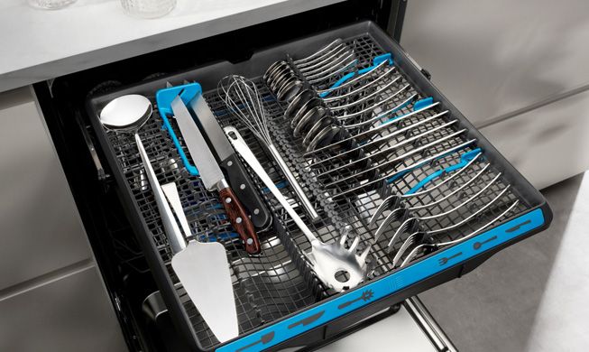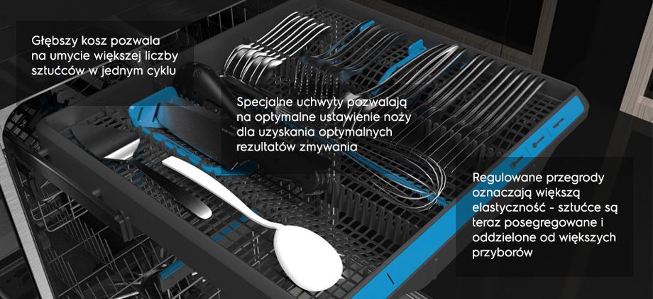 Посудомийні машини з третім кошиком MaxiFlex означають набагато більше свободи завантаження. Ви можете налаштувати розташування кошика, щоб легко розмістити як 14 комплектів посуду, так і об’ємне кухонне начиння в третьому кошику.