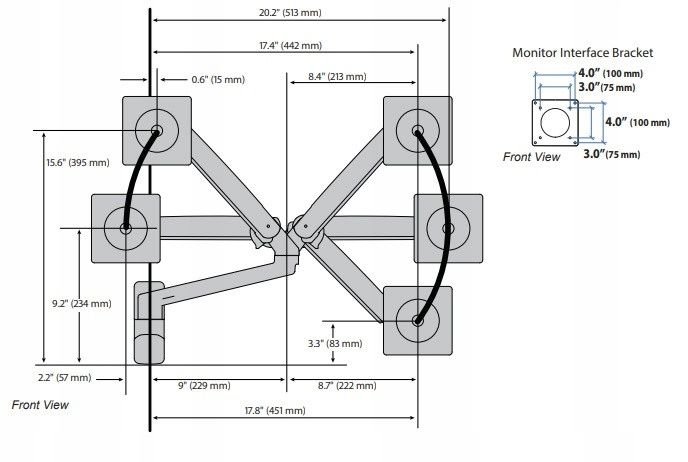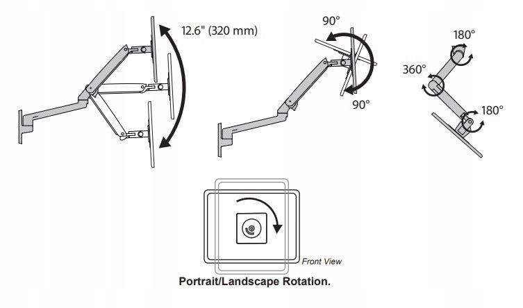 Діапазон нахилу: 90° назад, 90° вперед. Діапазон повороту: 180° біля основи; 360° між подовжувачем і рукою. Діапазон висування: 51 смМаксимальний діапазон висування: 63 см від задньої частини основи до монтажної пластини VES Вага продукту: 2,9 кг