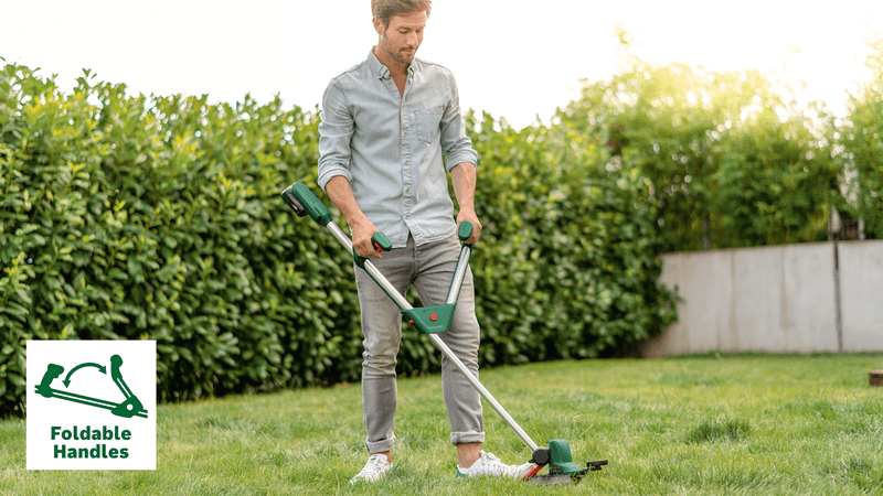 Універсальну головку можна легко повернути, натиснувши ножну педаль і повернувши або опустивши ручки, щоб зручно підрізати траву, що росте вздовж доріжок або під лавками.