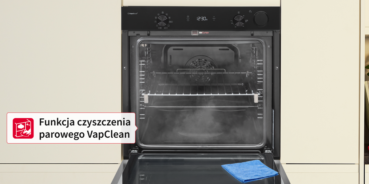 Просте очищення парою Функція очищення парою (VapClean) дозволяє легко видалити навіть найскладніші забруднення без використання миючих засобів. Просто налийте приблизно 200 мл води на дно духовки. Функція парового очищення менш ніж за годину пом'якшить забруднення, які можна легко видалити вологою ганчіркою. Це екологічне та дешеве рішення, яке без проблем утримуватиме духовку в чистоті. Для вашої зручності ви можете зняти скло дверцят духовки для очищення.