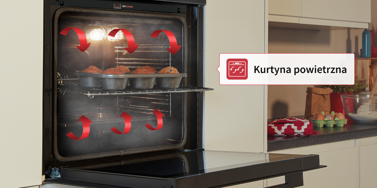 Захист від впливу гарячого повітря Повітряна завіса захищає від раптового вибуху гарячого повітря під час відкриття духовки. Завдяки цьому ви можете безпечно відкрити дверцята, щоб перевірити хід випікання або вийняти готову страву.