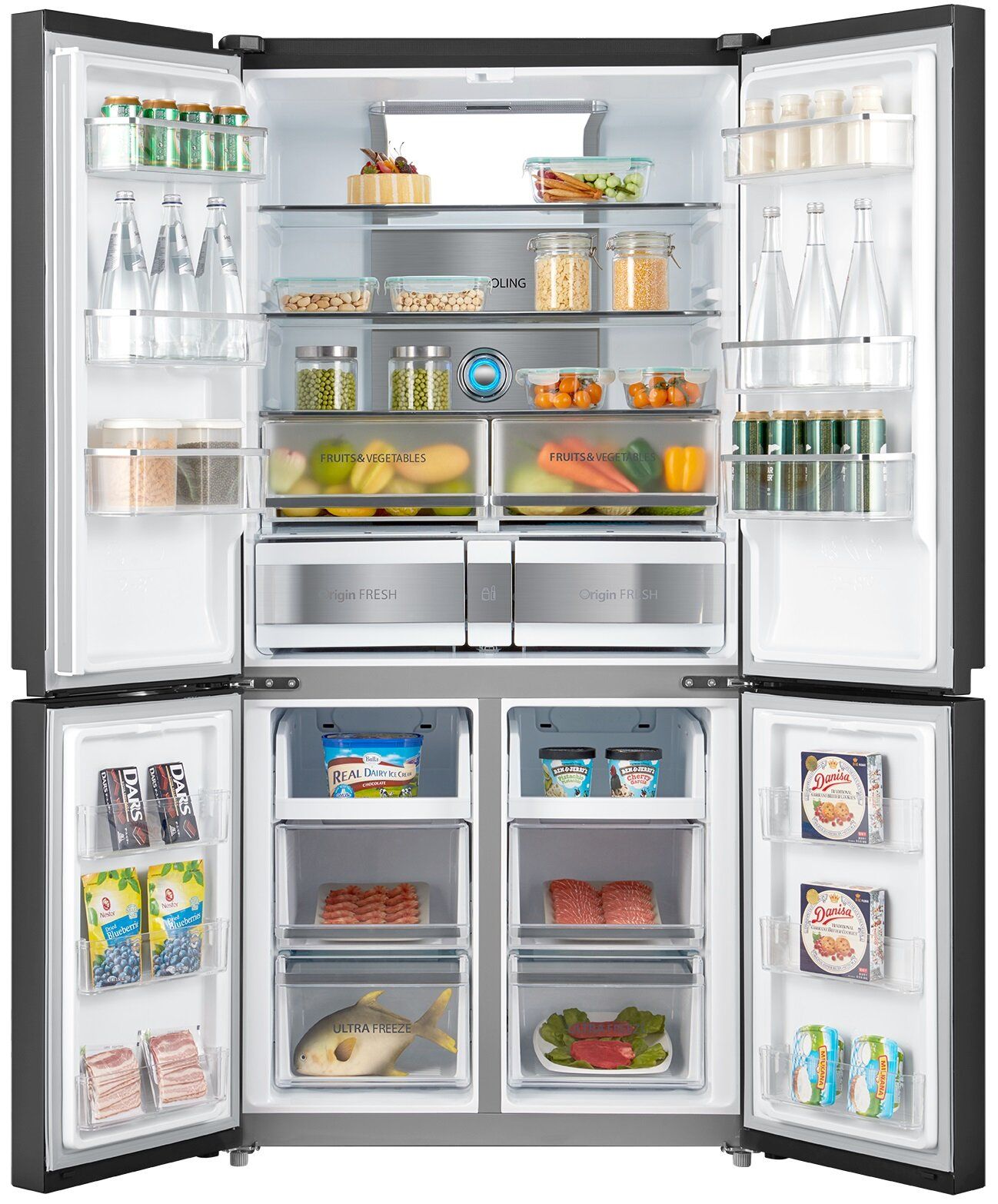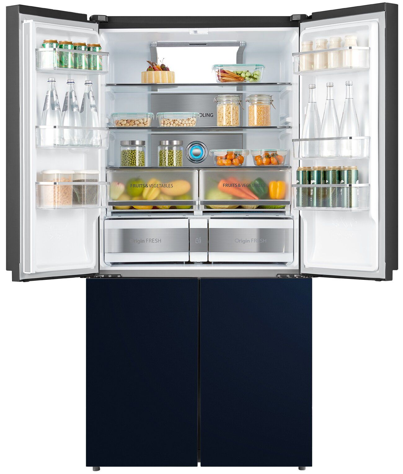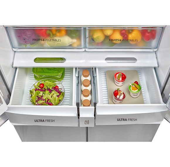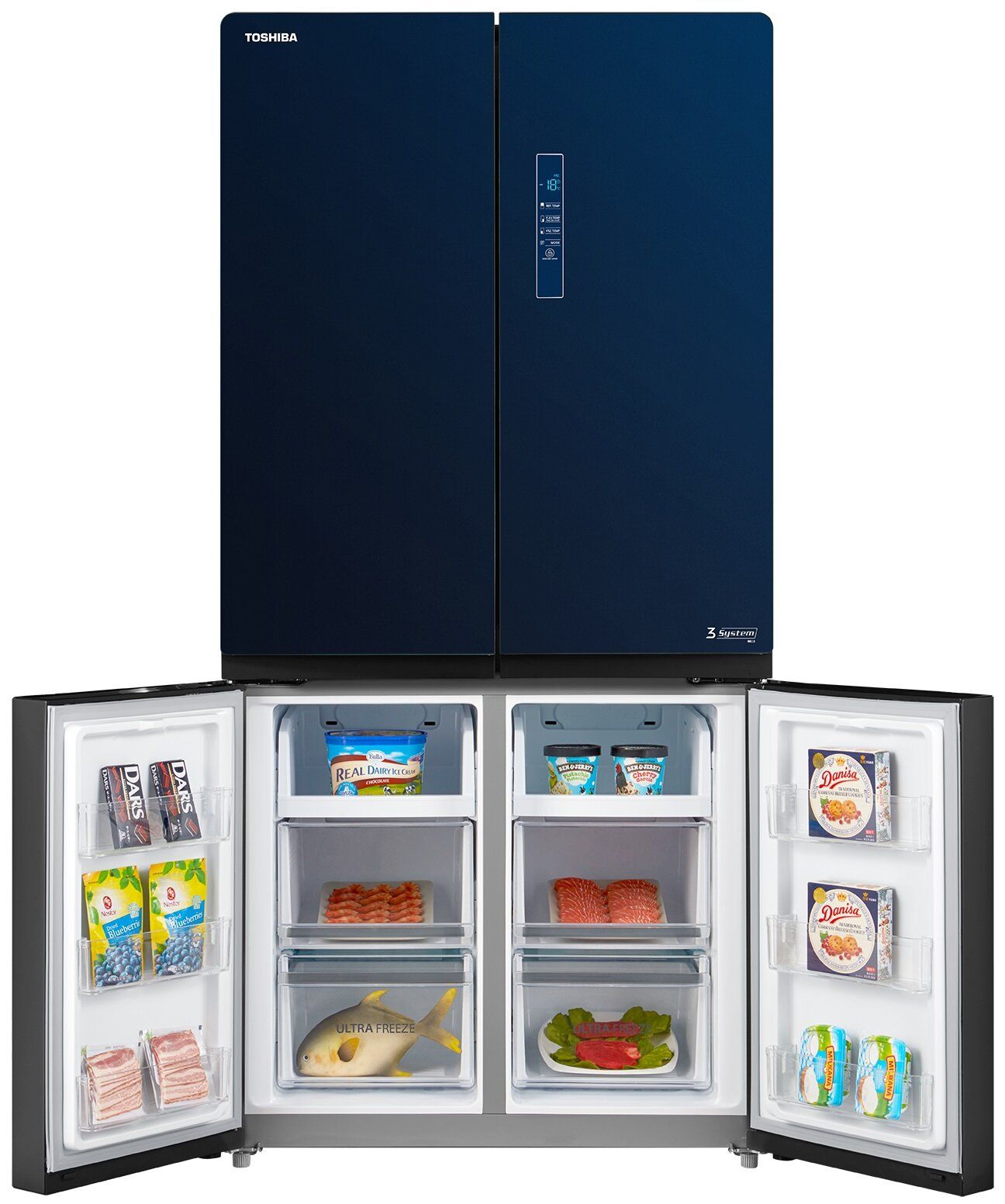 Холодильник Toshiba full no frost з інверторним двигуном, 4-дверний, загальною ємністю до 636 л, оснащений технологією Plasma Pure для усунення бактерій і неприємних запахів і технологією AlloyCooling для рівномірного охолодження повітря. Крім того, холодильна камера має дві зони для фруктів і овочів, окрему шухляду для ліків, 2 зони ультразаморожування та батьківський замок. Ця модель має цілих 26 місць для зберігання для надзвичайно легкої організації. Двері виготовлені з елегантного блакитного скла. Додатково нижню частину морозильної камери можна перевести в режим холодильної камери. Це, мабуть, найбільший холодильник на ринку, ідеальний для зберігання великої кількості їжі.