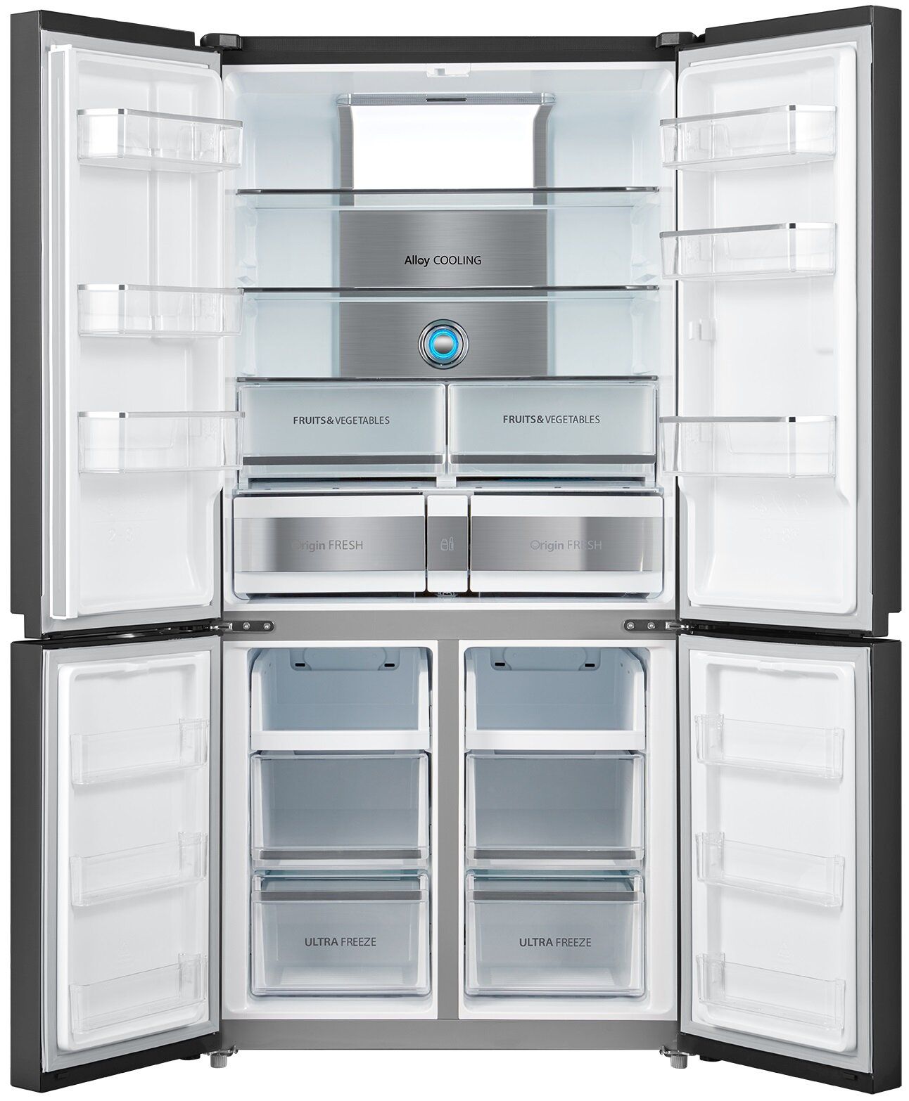 Обладнання 2 шухляди з незалежним контролем вологості, 3 скляні полиці, 6 дверних полиць, 2 шухляди з незалежним контролем температури
