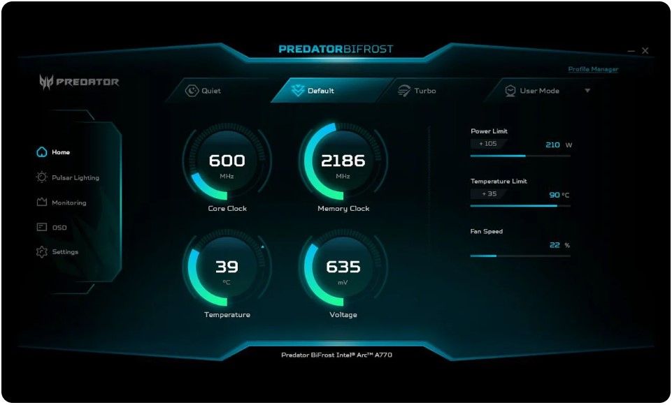 Стежте за своєю відеокартою, керуйте швидкістю вентилятора та регулюйте RGB-освітлення за допомогою програми Predator BiFrost Utility. Ви отримаєте доступ до безлічі опцій, таких як вибір готового режиму роботи або ручна зміна налаштувань і збереження їх у вашому власному режимі. Панель управління OSD дозволяє зчитувати найважливіші параметри в реальному часі, а також встановлювати комбінації клавіш і багато інших параметрів, які керують роботою карти.