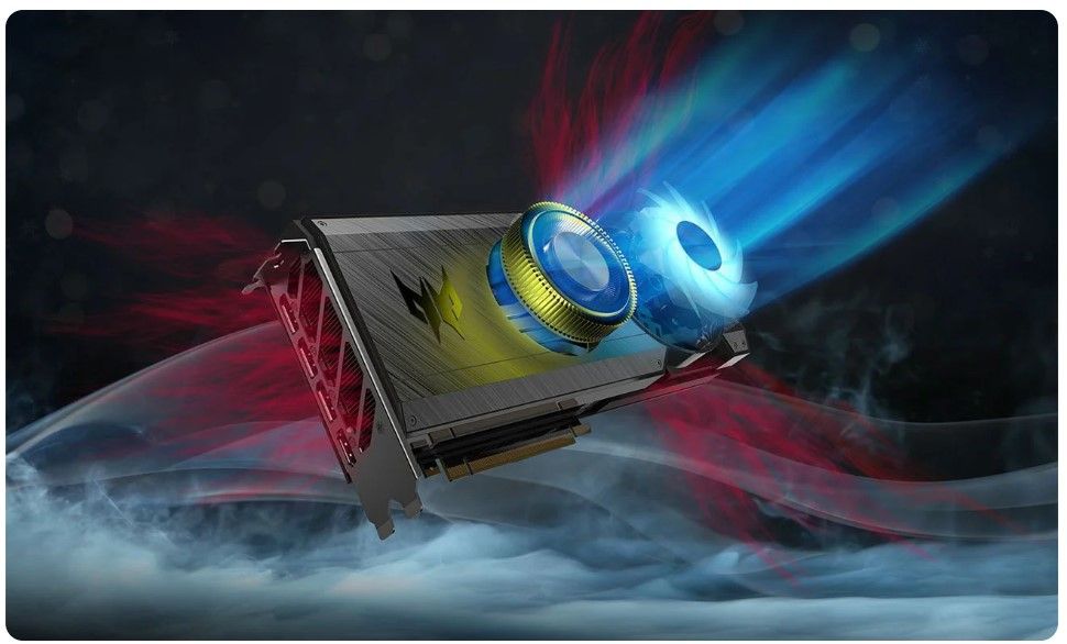 Для забезпечення найнижчих робочих температур карта Acer Predator BiFrost ARC A770 OC 16 ГБ GDDR6 оснащена унікальною системою охолодження. Він складається з вентилятора FrostBlade 2.0 і турбіни AeroBlade 3D. Вентилятор подає велику кількість холодного повітря в зону теплообміну, тоді як турбіна направляє повітря безпосередньо до радіатора. Його ласти були зроблені по-різному навколо кожного вентилятора, щоб повною мірою використовувати їхні можливості. Вони підключаються до парової камери, яка ефективно отримує теплову енергію від графічного процесора.