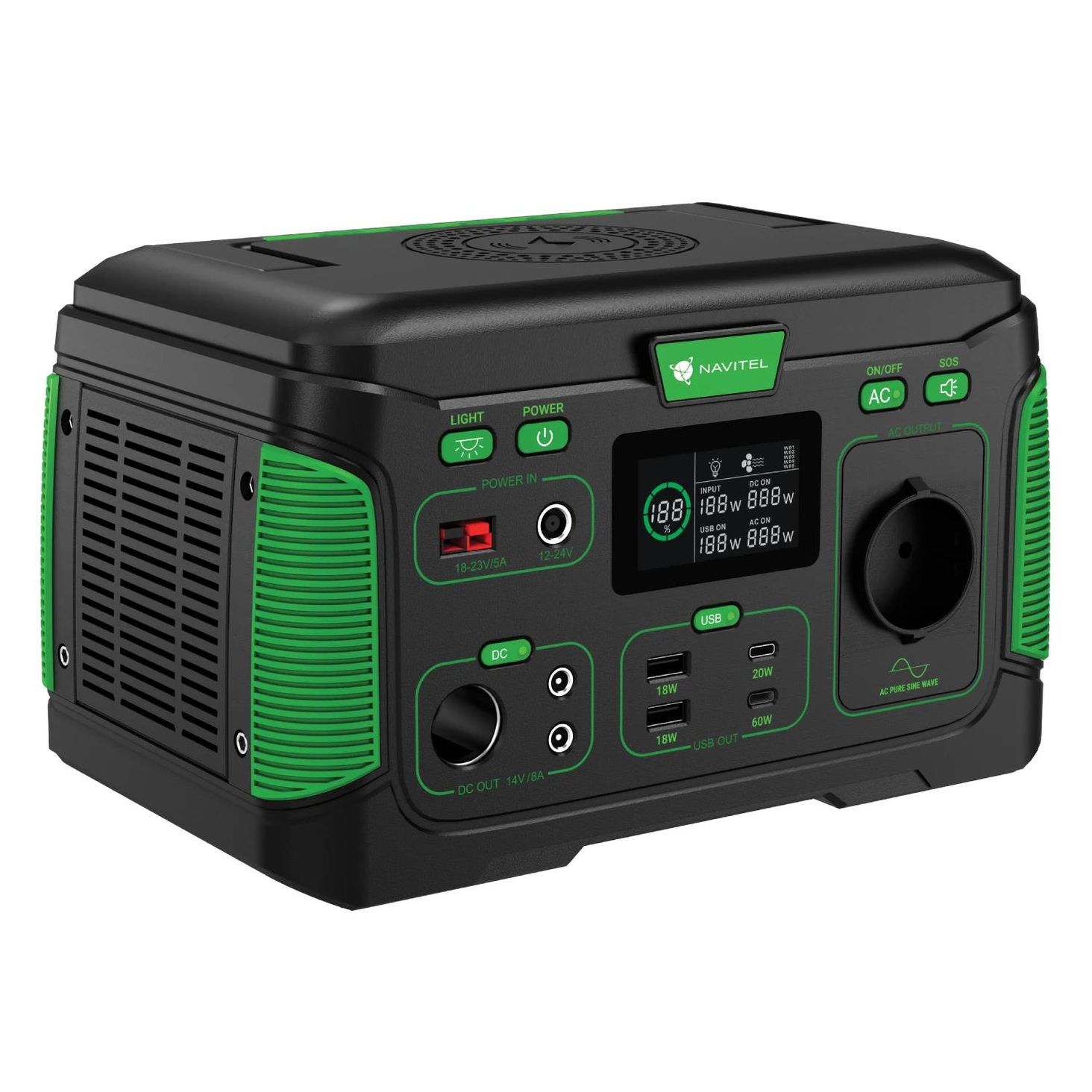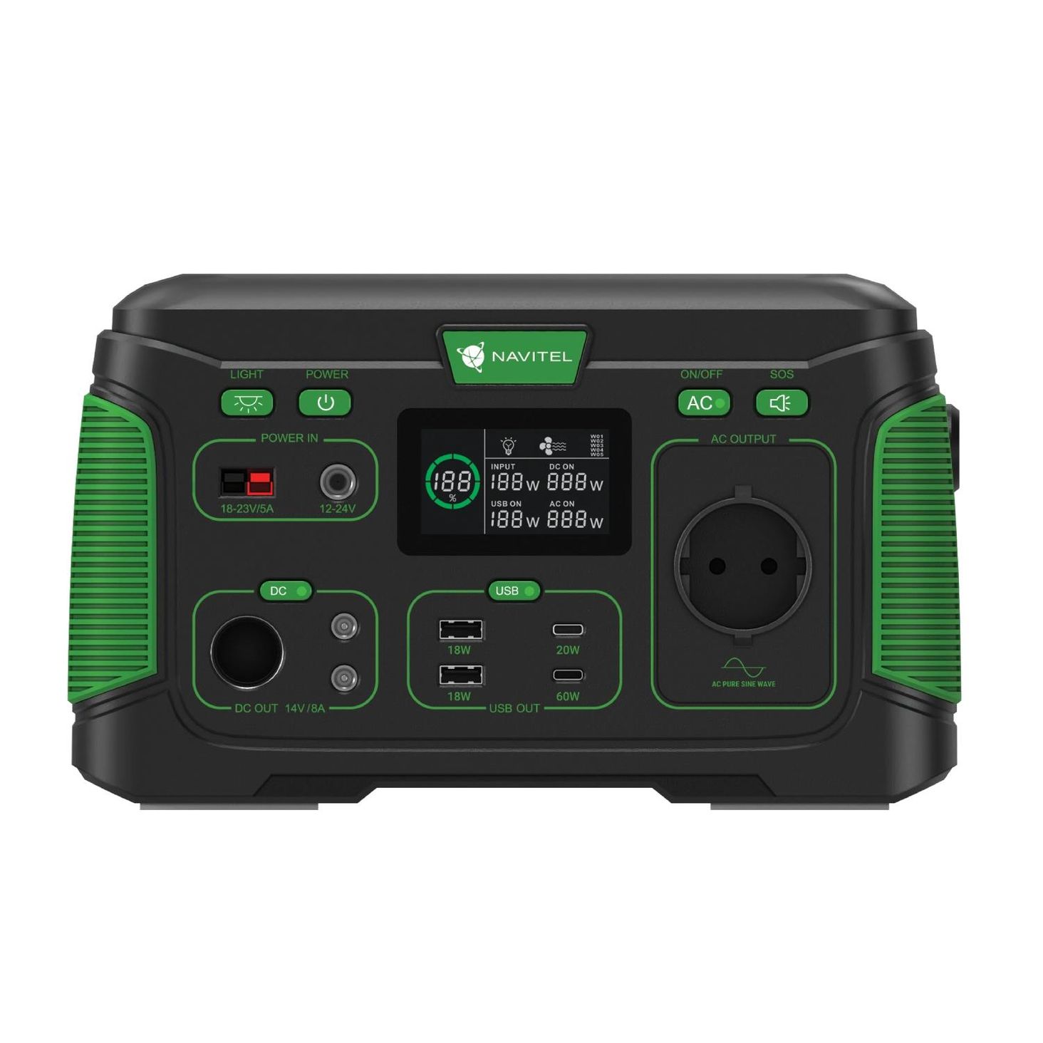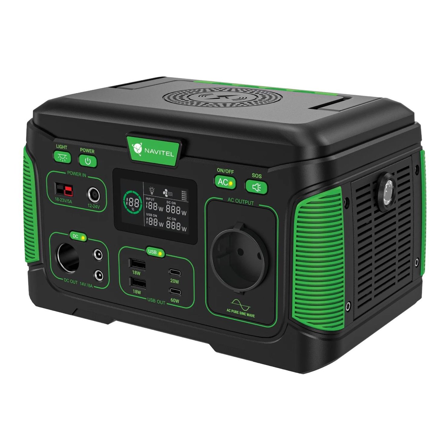 NAVITEL NS500: джерело живлення поза домом NAVITEL NS500 має вбудовану літієву батарею ємністю 444 Вт·год з розеткою 230 В змінного струму (загальна потужність 500 Вт). Станція безшумна, безпечна і зручна у використанні. Його можна використовувати вдома, у дорозі та на природі. Просто візьміть його з собою та насолоджуйтесь відпочинком на природі!